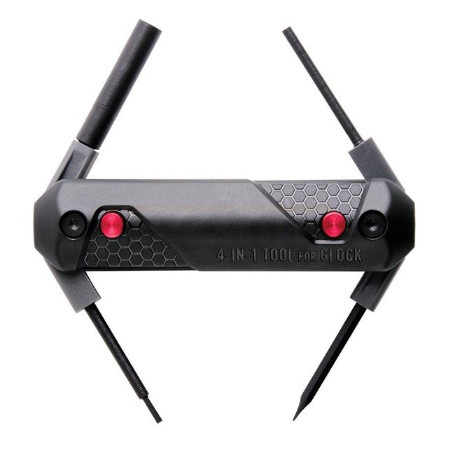 Élégant, ergonomique, bourré de fonctions. À tous points de vue, un outil d'armurier résolument moderne pour les propriétaires de Glock. Quatre outils différents se rangent à l'intérieur de la poignée et chacun s'ouvre et se verrouille en place en appuyant sur un bouton. Retirez les goupilles pour le démontage, changez les mires avant, retirez le ressort de verrouillage coulissant et le bloc de verrouillage et ajustez les mires arrière de rechange. Intelligent, précis, avancé...tout comme votre Glock. |