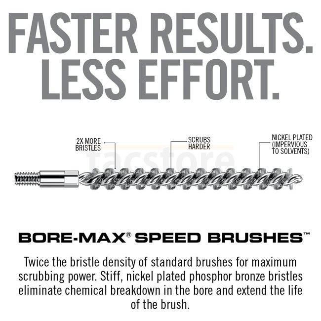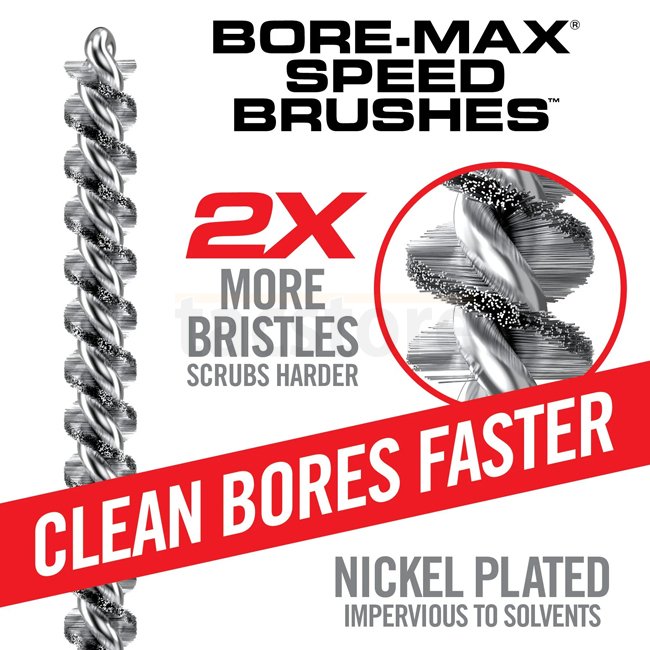 La Bore-Max Speed Brush offre une puissance de brossage supérieure grâce à une densité de poils doublée par rapport aux brosses standard. Ses poils rigides en bronze phosphoreux nickelé résistent à la dégradation chimique dans le canon, sont insensibles aux solvants et prolongent la durée de vie – idéale pour un nettoyage en profondeur efficace.