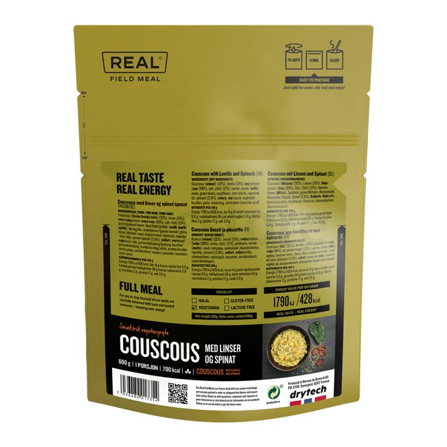 Pour être performant dans des conditions difficiles, vous devez vous assurer que votre alimentation est bien équilibrée, avec une quantité suffisante de glucides, de graisses et de protéines. REAL Field Meal est préparé par une équipe compétente de chefs, vous assurant un repas nutritif et léger - facile à préparer et riche en saveur naturelle.