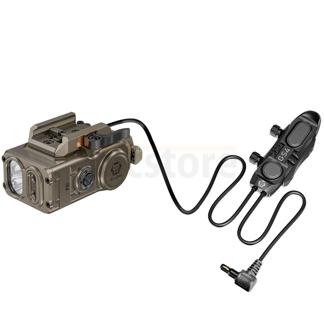 Une palette ambidextre offre les modes momentané ou continu. Un indicateur IR visible signale quand l’IR est actif. La sélection des modes se fait via une molette latérale. Le serrage sans outil et des attaches interchangeables conviennent aux rails Picatinny ou Glock. Lasers vert et IR coalignés pour un réglage précis à 27m. Compatible avec la série de Remote Switch GS de RovyVon; Remote Switch vendu séparément.