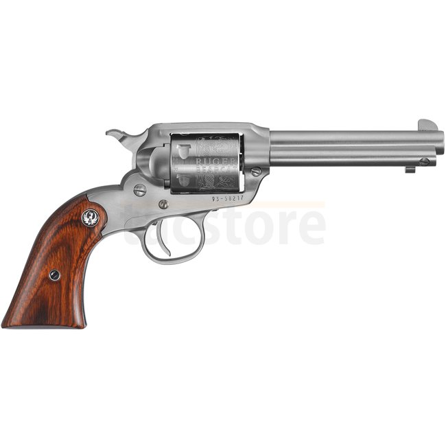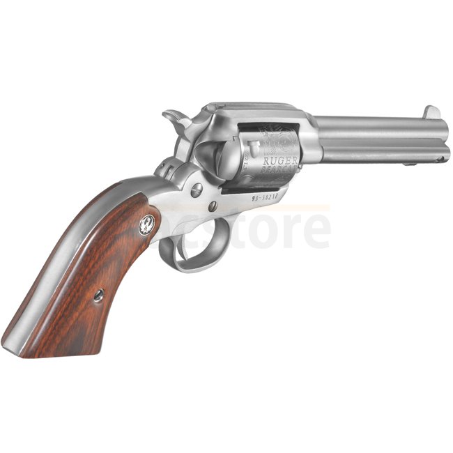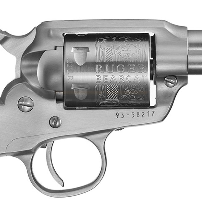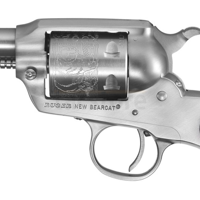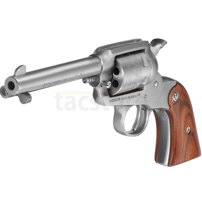 Le Ruger New Bearcat 22 LR Modèle 0913 marie le style western classique à la durabilité de l’inox moderne. Le barillet non cannelé décoratif présente une gravure d’ours et de cougar qui apporte une touche unique à ce revolver intemporel.