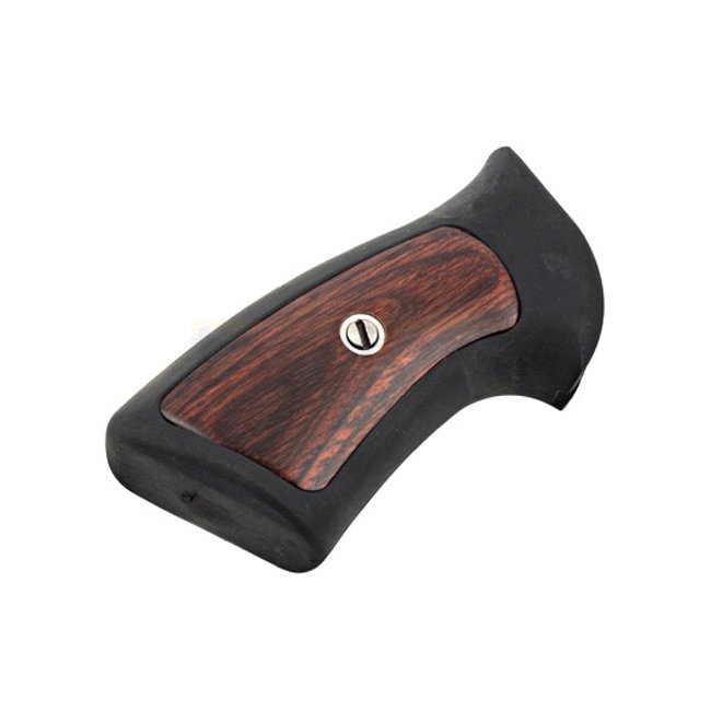 La poignée en caoutchouc avec incrustations en bois de rose allie ergonomie moderne et style classique. Conçue pour les revolvers Ruger à grande carcasse, elle assure un confort supérieur et une bonne maîtrise du recul.