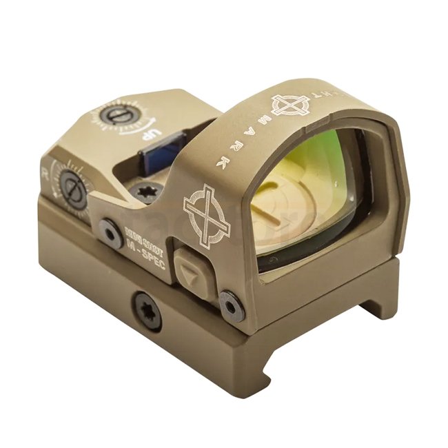 Viseur Reflex Sightmark Mini Shot M-Spec FMS en couleur terre sombre avec grossissement 1x, réticule point rouge de 3 MOA et 10 niveaux de luminosité. Taille compacte avec une longueur de 56 mm et léger à 85 g. Idéal pour une acquisition rapide de la cibl