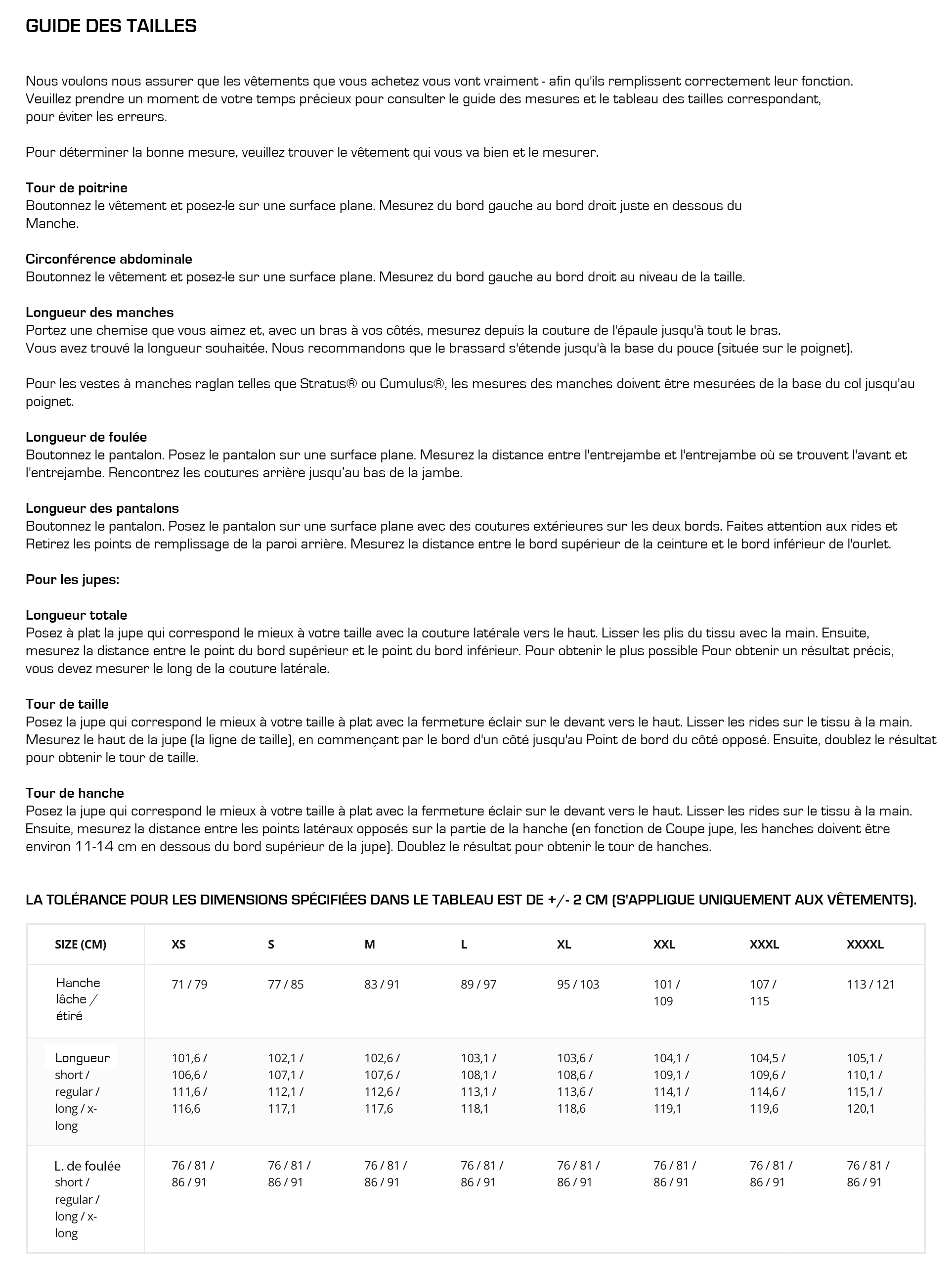 Tableaux des tailles