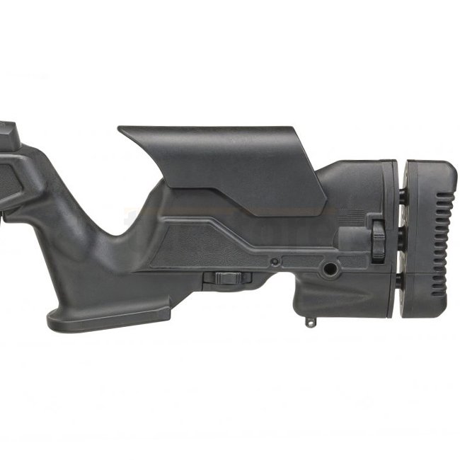 La crosse en composite noir est entièrement réglable, offrant un ajustement ergonomique pour diverses positions de tir.