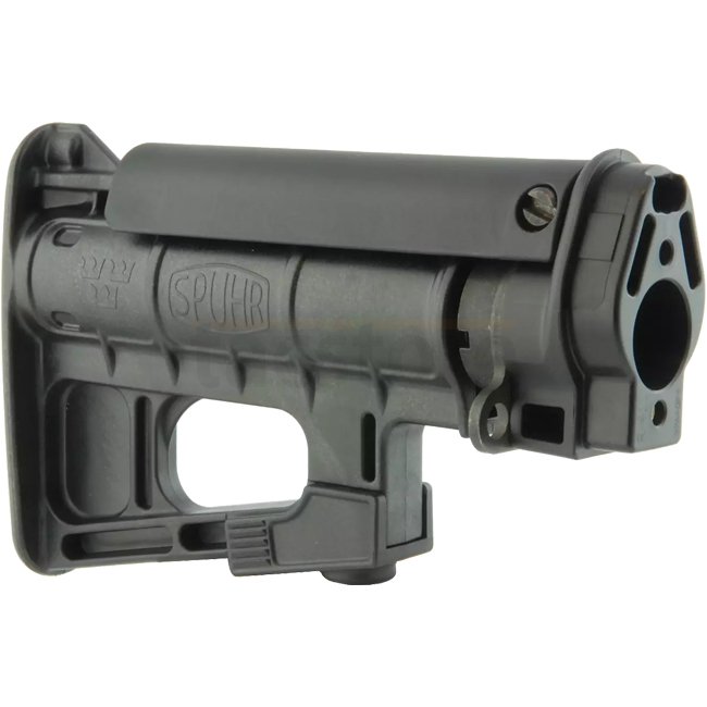 Le Spuhr R-410 est une crosse réglable en 6 positions conçue pour moderniser la plateforme HK G3, améliorant la maniabilité et la gestion du recul. Utilisant le capuchon d'extrémité d'origine, cette crosse offre un réglage complet de la longueur et dispose d'une pièce de joue fixe alignant l'œil du tireur avec les dispositifs optiques.