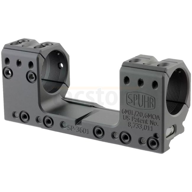 La Spuhr SP-3601 est une monture de lunette monobloc de haute précision, conçue pour les fusils équipés de rails MIL-STD-1913 ou STANAG 4694. Elle est particulièrement adaptée aux fusils à verrou avec des rails Picatinny monoblocs. Cette monture offre une inclinaison de 6 MIL (20,6 MOA), idéale pour le tir longue distance nécessitant des ajustements supplémentaires en élévation.