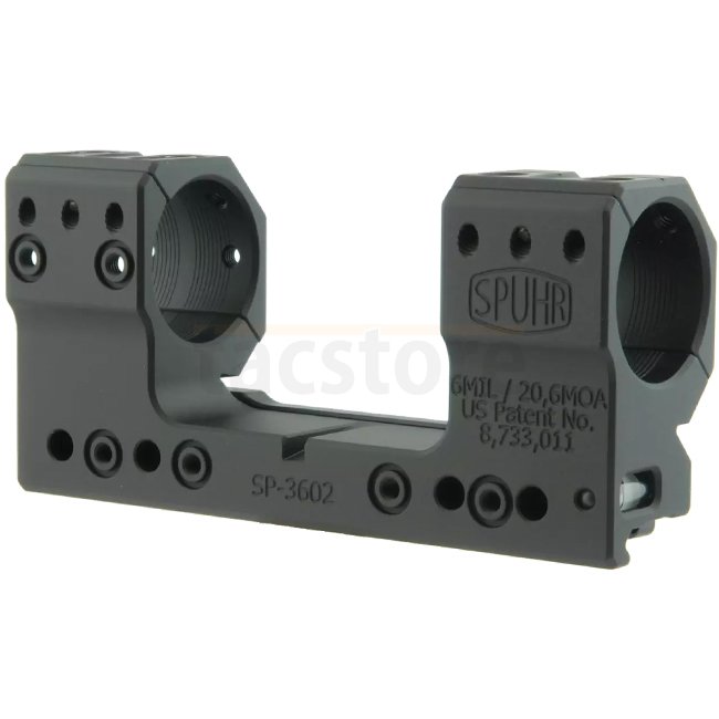 La Spuhr SP-3602 est une monture de lunette monobloc de haute précision, conçue pour les fusils équipés de rails Picatinny MIL-STD-1913 ou STANAG 4694. Elle est particulièrement adaptée aux rails Picatinny étendus combinés avec des équipements de vision nocturne. Cette monture offre une inclinaison de 6 MIL (20,6 MOA), idéale pour le tir longue distance nécessitant des ajustements supplémentaires en élévation.