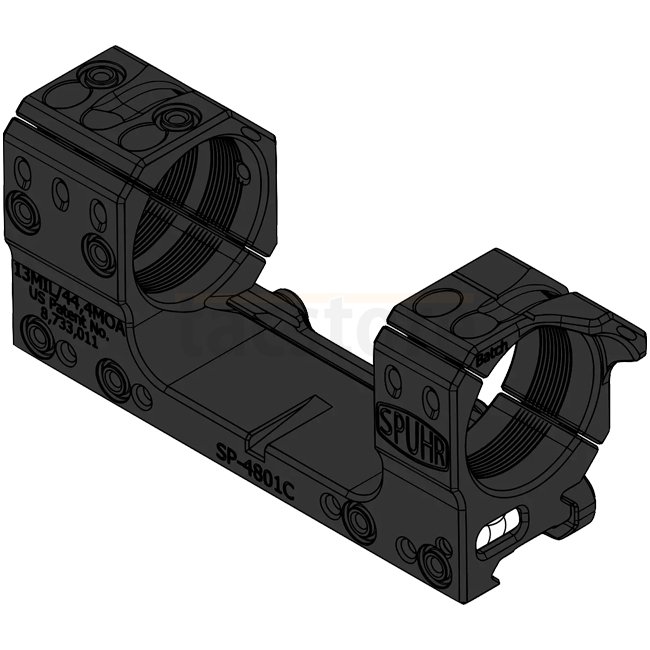 La Spuhr SP-4801C est une monture de lunette de haute qualité conçue pour les fusils équipés de rails Picatinny conformes aux normes MIL-STD-1913 ou STANAG 4694. Elle est particulièrement adaptée aux fusils à verrou dotés de rails Picatinny monoblocs. Cette monture offre une inclinaison de 13 MIL (44,4 MOA), permettant des ajustements précis pour le tir à longue distance. Avec une hauteur de 30 mm et une longueur totale de 130 mm, elle garantit une grande polyvalence pour différentes configurations de tir.