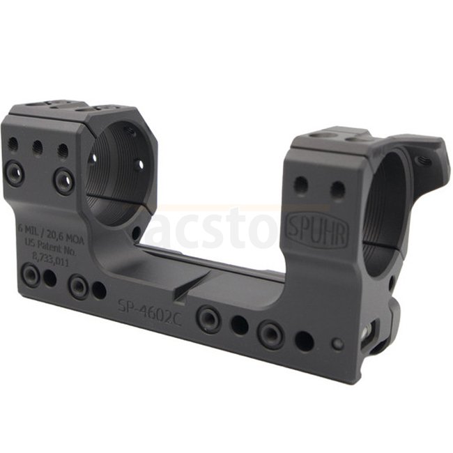La Spuhr SP-4602C est une monture de lunette de haute qualité conçue pour les fusils équipés de rails Picatinny conformes aux normes MIL-STD-1913 ou STANAG 4694. Elle est particulièrement adaptée aux objectifs de 56 mm et aux rails Picatinny prolongés combinés à des équipements de vision nocturne. Cette monture offre une inclinaison de 6 MIL (20.6 MOA), permettant des ajustements précis pour le tir à longue distance. Avec une hauteur de 38 mm et une longueur totale de 130 mm, elle garantit une grande polyvalence pour différentes configurations de tir.