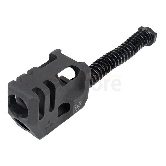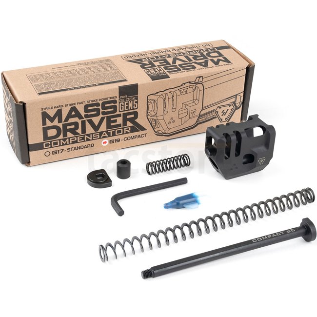 Le Strike Industries Mass Driver Compensator (MDC) représente un bond en avant dans la conception des compensateurs, puisque les conceptions actuelles sont restées largement inchangées depuis les années 1930. Le Mass Driver Compensator est entraîné par les gaz chauds expulsés à travers le canon après le déchargement de la cartouche et agit comme un système de contrepoids pour atténuer le recul mécanique. En séparant le compensateur des composants opérationnels après l'allumage, le MDC permet des vitesses cycliques proches de celles d'origine et réduit la masse alternative.