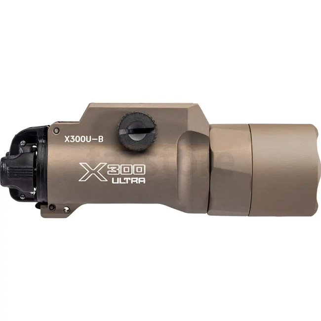 Le SureFire X300U-B LED Light de couleur tan est un outil d'éclairage puissant avec une sortie de 1000 lumens, offrant une autonomie de 1,25 heures. Il dispose de modes d'activation permanente et momentanée, une portée de 213 mètres, un boîtier IPX-7, une
