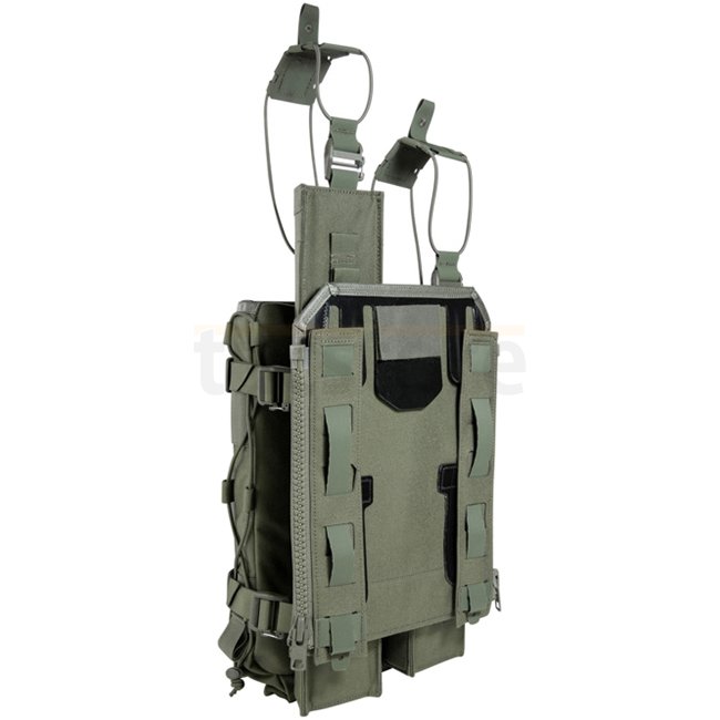 La plaque de base renforcée permet l’intégration de deux tubes à outils amovibles. Le compartiment principal dépliable accueille des coupe-barres jusqu’à 80 cm. Des boucles élastiques latérales retiennent des breach-pens. Le pack comprend en plus une bande MOLLE à zip et un adaptateur pour montage sur systèmes MOLLE classiques, garantissant une très grande adaptabilité.