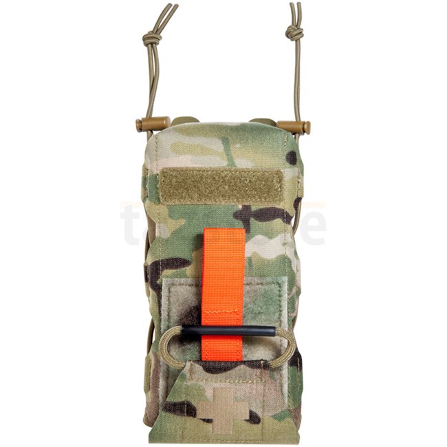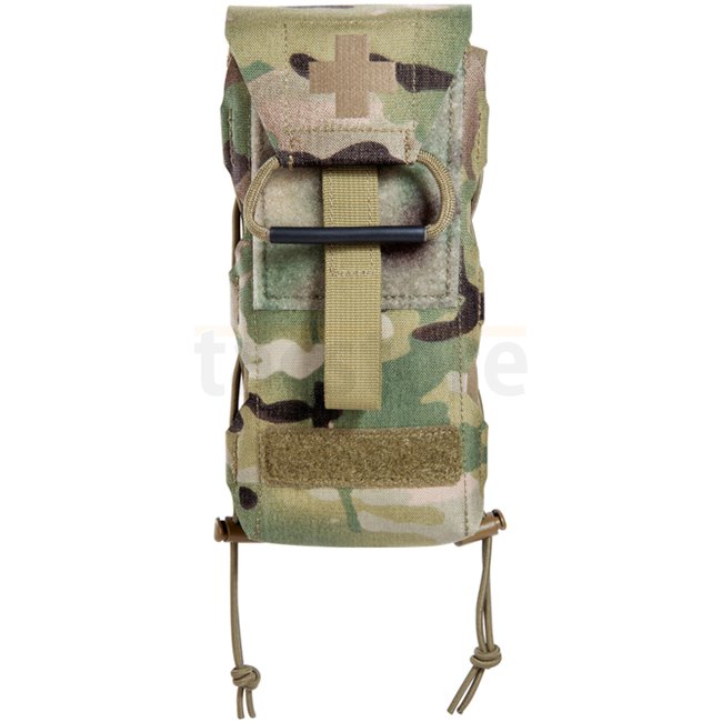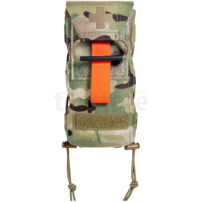 Cette pochette de premiers secours mince en Multicam nécessite seulement deux boucles MOLLE pour la fixation. Le panneau interne extractible peut être placé vers le haut ou vers le bas selon la façon dont la pochette est installée. Un passage simple est prévu entre une fermeture auto-agrippante fixe et un accès rapide.