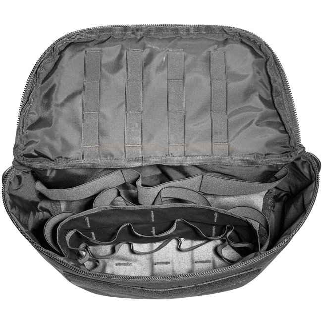 Sac médical Tasmanian Tiger conçu de manière ergonomique, en couleur noire, avec des cloisons intérieures intelligentes pour le matériel médical. Le couvercle s'ouvre vers le haut pour un accès facile, comprend un étui pour ciseaux. Les poches latérales s