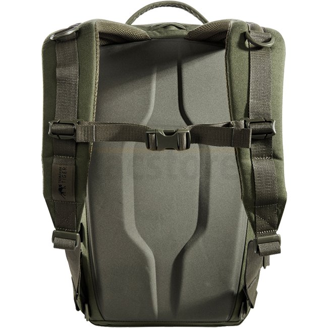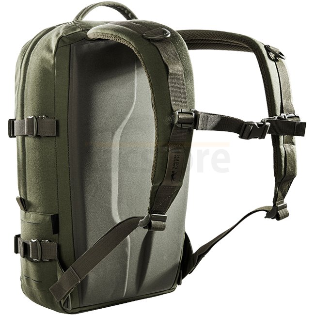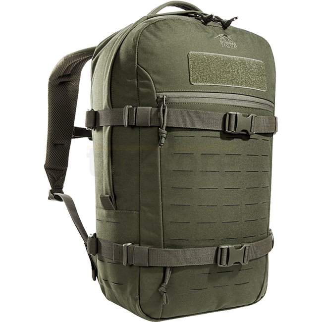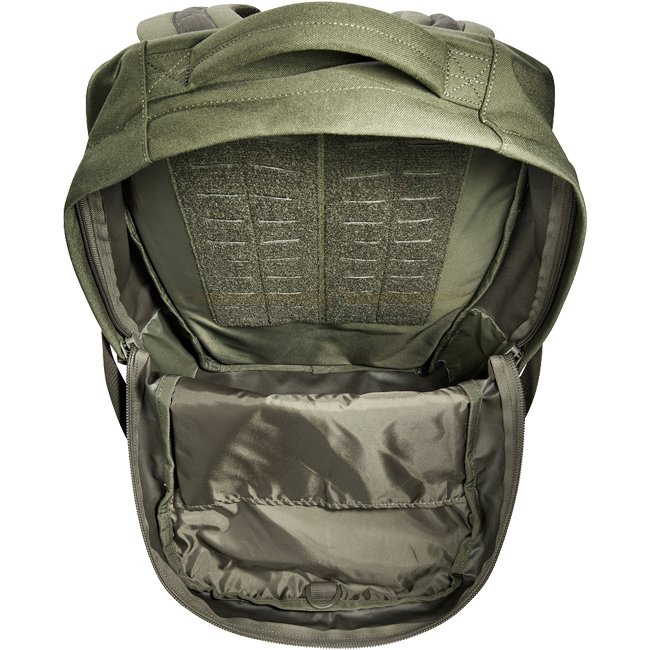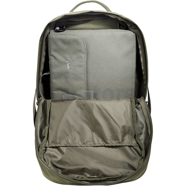 Sac à dos modulaire Tasmanian Tiger XL en Olive. Volume de 23L compatible avec le système MOLLE pour pochettes à boucles. Convient à un ordinateur portable de 15,4 pouces, comportant diverses poches et un système MOLLE découpé au laser pour personnalisati