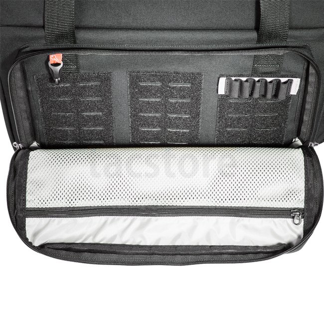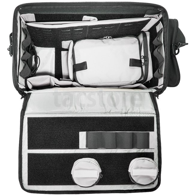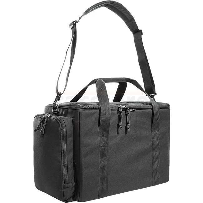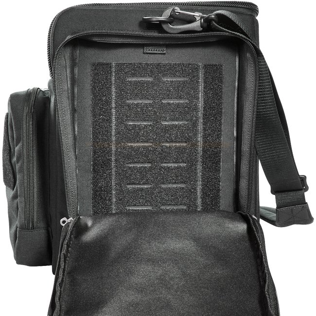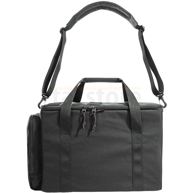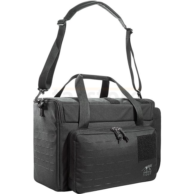 Sac de Tir Modulaire Tasmanian Tiger - Noir : Sac d'entraînement modulaire pour tireurs avec séparateurs ajustables, fermetures éclair verrouillables et multiples options de rangement. Comprend une bandoulière détachable, des poignées rembourrées et un re