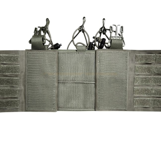 Harnais de ceinture léger, flexible et modulaire - Tasmanian Tiger Small Combi Rig IRR en Stone Grey Olive. Module de magazine amovible auto-agrippant pour porte-plaques. Caractéristiques des sangles plates rembourrées ajustables et des inserts de magazin