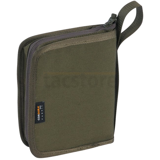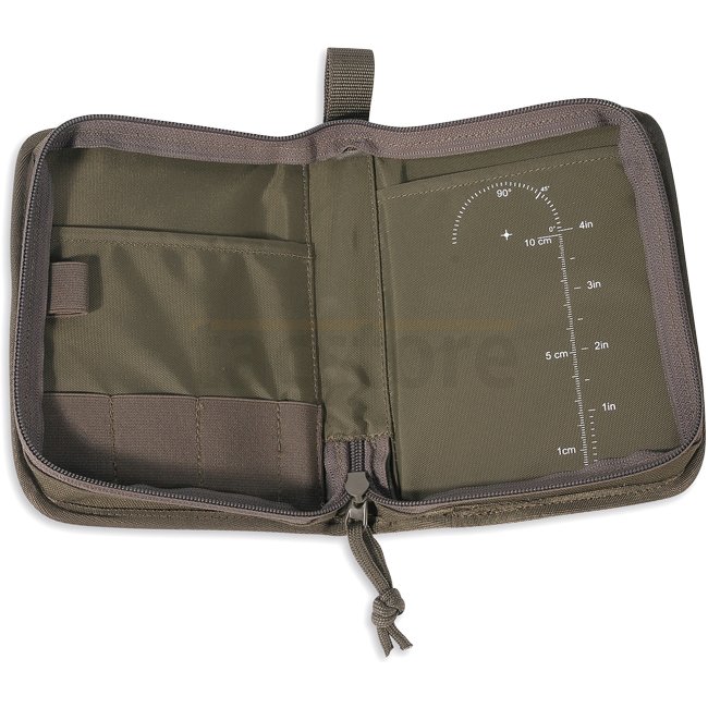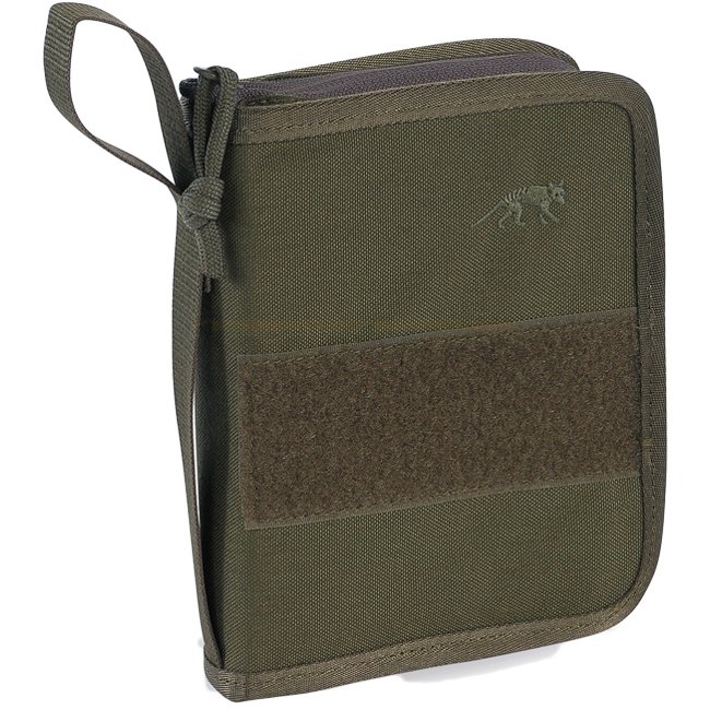 Carnet de terrain tactique Tasmanian Tiger en Olive, un classeur de bloc-notes compact de taille DIN A6 conçu comme un livre de tireur d'élite. Comprend une boucle pour la main, un compartiment pour bloc-notes DIN A6, et un compartiment pour carte SD.
