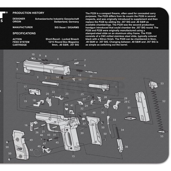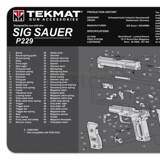 Tapis de nettoyage et de réparation TekMat très polyvalent pour SIG P229. Parfait pour l'entretien des armes, tout en étant idéal comme tapis de travail ou accessoire de bureau. Conception mince avec une épaisseur de 3 mm, mesurant 43 x 28 cm.