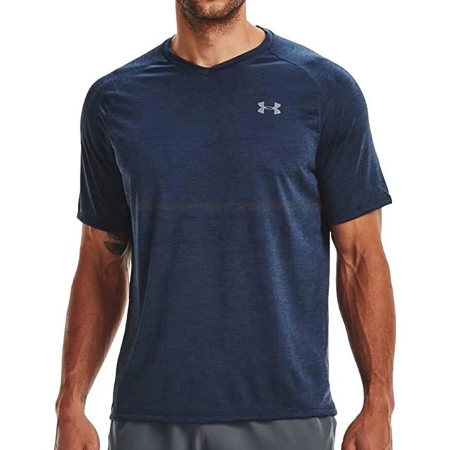 Restez au frais et à l'aise pendant votre entraînement avec le V-Neck à manches courtes Tech de Under Armour en bleu. Ce t-shirt de taille moyenne est parfait pour les personnes actives à la recherche de vêtements haute performance.
