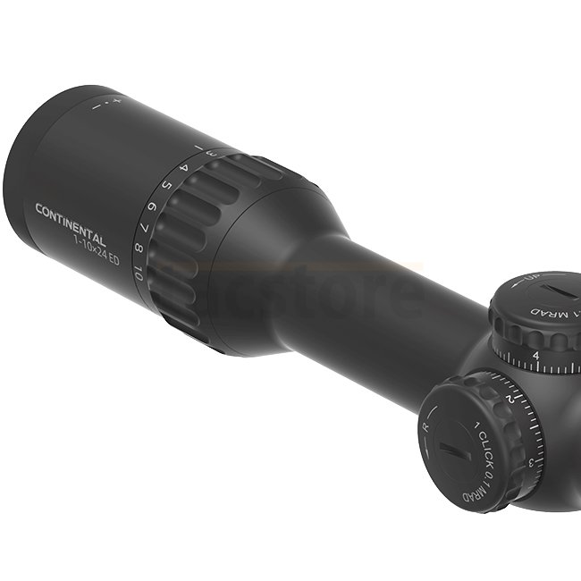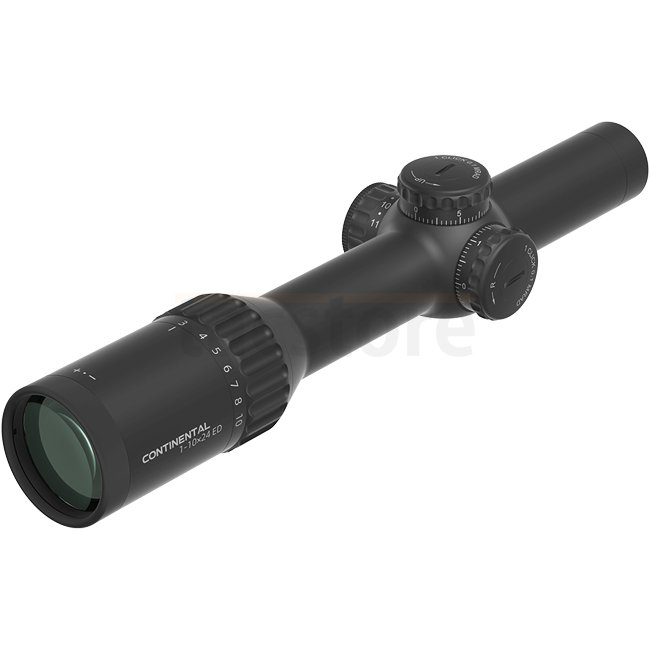 Le Continental X10 offre un zoom 1–10× avec un mode 1× réel pour visée à deux yeux ouverts. Le réticule VCO-7MIL en deuxième plan focal avec fibre et 11 niveaux d’illumination reste visible en plein jour. Les optiques en verre Schott HT, LaREE & VePRO FMC ED assurent plus de 93 % de transmission lumineuse, offrant des images nettes et lumineuses.