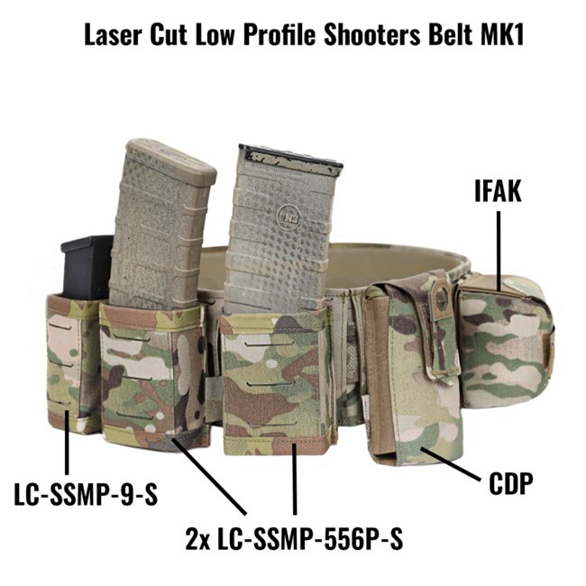 Le Low Profile Laser Cut Shooter MK1 Belt de Warrior est une plateforme à deux niveaux, très légère et extrêmement robuste, capable de transporter une grande variété de pochettes et d'holsters spécifiques à chaque mission, y compris des drop leg rigs. La première partie est une ceinture mince en One Wrap Velcro, conçue pour être insérée dans les passants de ceinture du pantalon de l'opérateur, fonctionnant de la même manière qu'une ceinture traditionnelle. La deuxième partie est un Low-Profile Laser Cut Belt (LPLB) avec des découpes permettant la fixation de pochettes. Cette ceinture dispose de Velcro crochet à l'intérieur, se mariant avec le premier ceinture pour offrir une base stable et ferme.