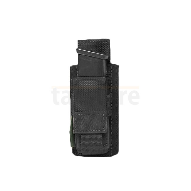 Pochette pour un seul chargeur de pistolet 9mm Warrior en noir. Pochette compatible MOLLE pouvant contenir 1 chargeur de pistolet 9mm. Le design polyvalent permet une utilisation ouverte ou fermée. Comporte une rangée horizontale de MOLLE.