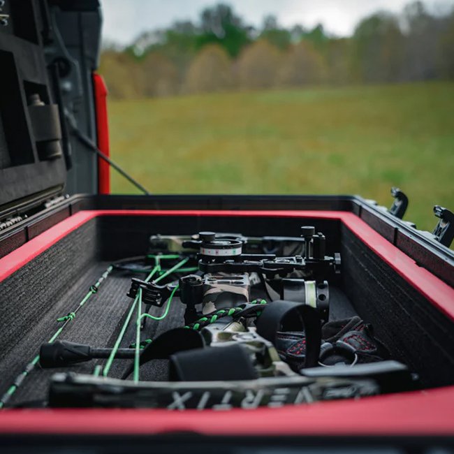 Sehr großes, robustes Schutzgehäuse aus NK-7-Resin mit PowerClaw-Verriegelungssystem, automatischem Druckausgleichsventil, Soft-Grip-Griff, mehreren Tragegriffen und kugelgelagerten Rollen. Dieses Refurbished-Modell ist technisch vollständig funktionsfähig, kann jedoch leichte Gebrauchsspuren aufweisen. Die vorinstallierte Schaumstoffeinlage bietet sicheren Schutz und strukturierte Aufbewahrung für Bögen, Pfeile und Zubehör.