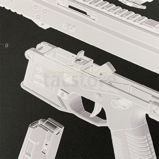 Die äusserst grosszügige, knapp 90cm lange und 45cm hohe Matte, weisst rundum vernähte Kanten auf. Mit einer Dicke von 3mm sorgt sie für den nötigen Schutz von Oberflächen und trägt dennoch nicht zu stark auf um ein Arbeiten darauf angenehm zu gestalten. Die detailreiche und originalgetreue Explosionszeichnung zeigt alle Bauteile der dargestellten Waffe auf.