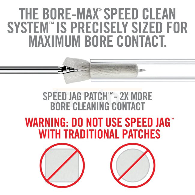 Das System enthält eine Bore-Max Speed Brush mit doppelt so dichter Borstenanordnung wie herkömmliche Bürsten und vernickelte Phosphor-Bronze zur erhöhten Haltbarkeit. Der Speed Jag mit Kompressionsringen und die synthetischen Speed Jag Patches bieten bis zu viermal besseren Kontakt als traditionelle Jag-Patches. 75 Patches sind im Set enthalten.
