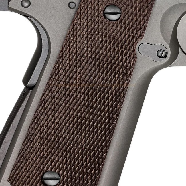 Klassische 1911-Optik, modern gefertigt. Geschmiedetes Stahlgehäuse und Schlitten, 127 mm Match-Lauf aus Edelstahl, feste 3-Punkt-Visierung und Vollholz-Composite-Griffe.