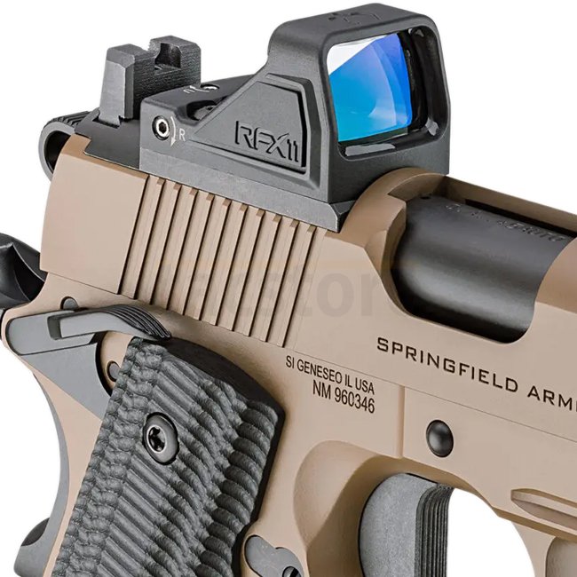 Kompakte, optics-ready 1911 für Verteidigung und Nahbereich Schiessen. Geschmiedeter Carbonstahl-Schlitten und Gehäuse, 146 mm CMV-gewindelauf, frei schwebende Picatinny-Schiene, VZ G10 Griffplatten und Coyote Brown Oberfläche.