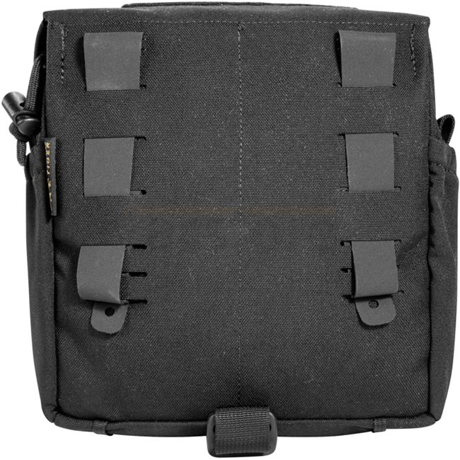 Die Tasche ist mit einem Lasche-Deckel samt Steckschließe ausgestattet. Zwei elastische Seitentaschen und eine Daisy Chain an der Front bieten zusätzliche Fixier- und Erweiterungsmöglichkeiten. Die Rückseite nutzt das Reverse-MOLLE-System für stabile Befestigung an Westen, Gurten oder Rucksäcken und erfordert vier MOLLE-Schlaufen zur Montage.