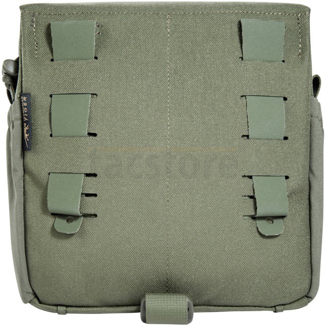 Die Tasche ist mit einem Lasche-Deckel samt Steckschließe ausgestattet. Zwei elastische Seitentaschen und eine Daisy Chain an der Front bieten zusätzliche Fixier- und Erweiterungsmöglichkeiten. Die Rückseite nutzt das Reverse-MOLLE-System für stabile Befestigung an Westen, Gurten oder Rucksäcken und erfordert vier MOLLE-Schlaufen zur Montage.