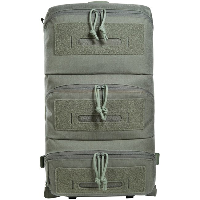 - MOLLE-Flächen intern für modulare Erweiterung; drei Fronttaschen mit verschiedenen Innenaufteilungen und Klettflächen zur Beschriftung