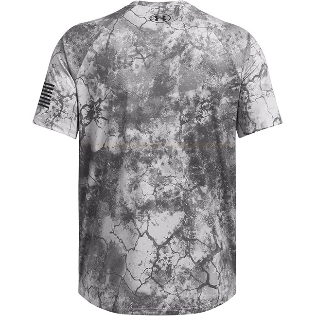 Das UA Tech Freedom Camo T-Shirt kombiniert funktionales Material mit einem markanten Camo-Design und patriotischem Freedom-Logo.