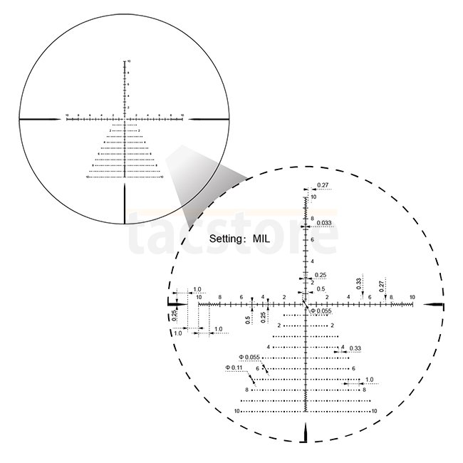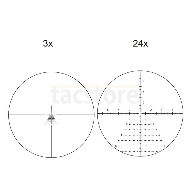 Dieses hochpräzise Zielfernrohr wurde für Long-Range und Wettbewerbsschießen entwickelt. Es bietet einen Vergrösserungsbereich von 3- bis 24-fach mit einem 56 mm Objektiv für maximale Lichtaufnahme. Der 34 mm Monorohrkörper ermöglicht grosszügige Verstellbereiche (Höhe bis ca. 30 MIL, Seite bis ca. 20 MIL) bei einem Klickwert von 1/10 MIL und verfügt über Zero-Stop-Türme. Ausgestattet mit extra-niedriger Dispersion (ED) Glas, vollmehrfach vergüteten Linsen, Seitenfokus ab etwa 10 m, wasserdicht nach IP67 und stoßfest bis 1000 G.